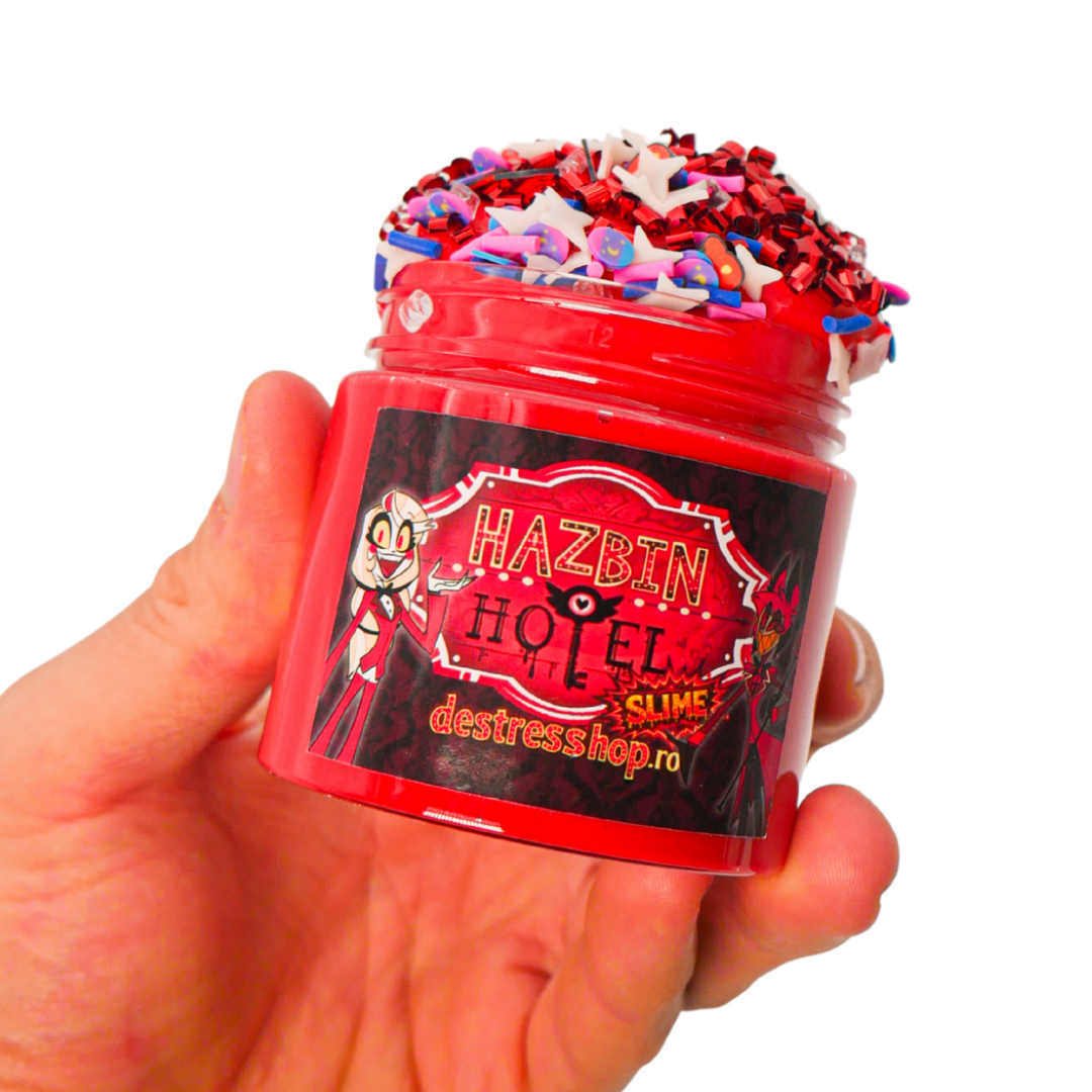 - 1 borcănaș de slime HAZBIN HOTEL SLIME – Textură Thick & Glossy, densă, grea și cu un luciu intens.